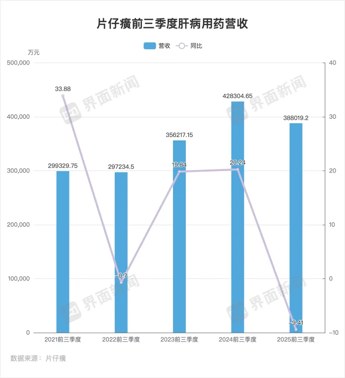 據片仔癀2025年前三季度主要經營數據公告,肝病用藥實現營收38.8億元,同比下降9.41%。