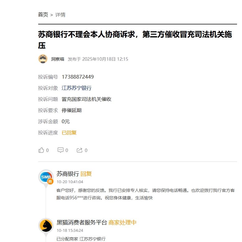 10月18日,一位借款人在黑貓投訴平台發起投訴,稱蘇商銀行第三方催收人員冒充國家司法機關工作人員進行催收。