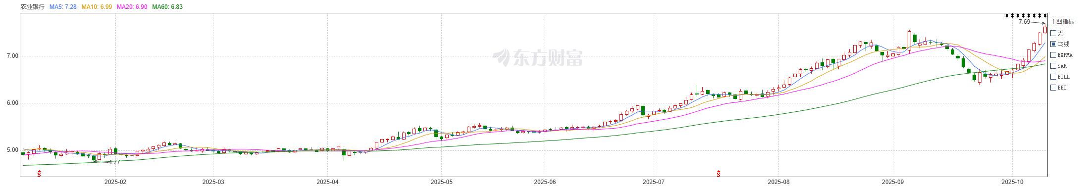 10月20日,三大指數集體上漲。其中,銀行股表現分化,近期備受關注的農業銀行維持強勁表現,報7.74元/股,漲1.57%,日線錄得12連陽。