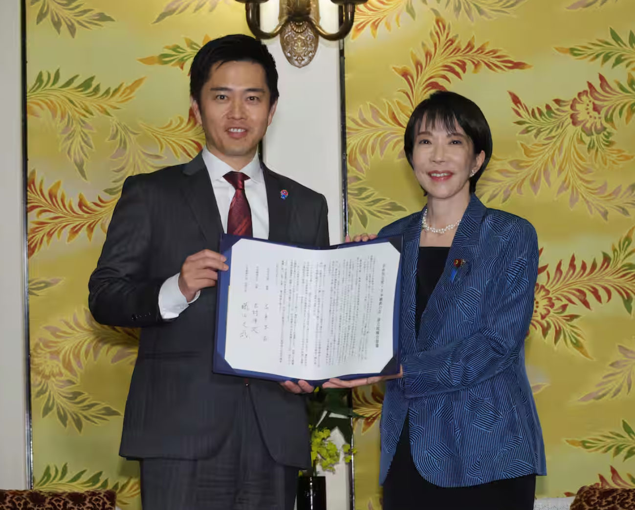 據日本媒體報道,當地時間20日,日本自民黨總裁高市早苗與日本維新會代表吉村洋文在東京舉行會談,並簽署了關於兩黨聯合執政的協議文件。