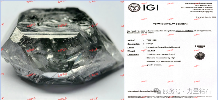 近日,在第十五屆中國河南國際投資貿易洽談會上,力量鑽石宣佈通過高温高壓法成功培育出一顆重達156.47克拉的鑽石原石。並通過了國際寶石研究院(IGI)鑑定,該鑽石為目前已知全球最大的人工培育鑽石單晶,刷新了2022年由Meylor Global公司保持的150.42克拉世界紀錄,標誌着鑽石功能化應用時代即將到來。