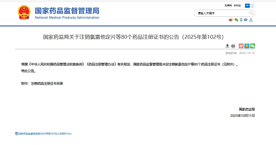 10月15日,國家藥品監督管理局發佈第102號公告,決定註銷氯雷他定片等80個藥品註冊證書。