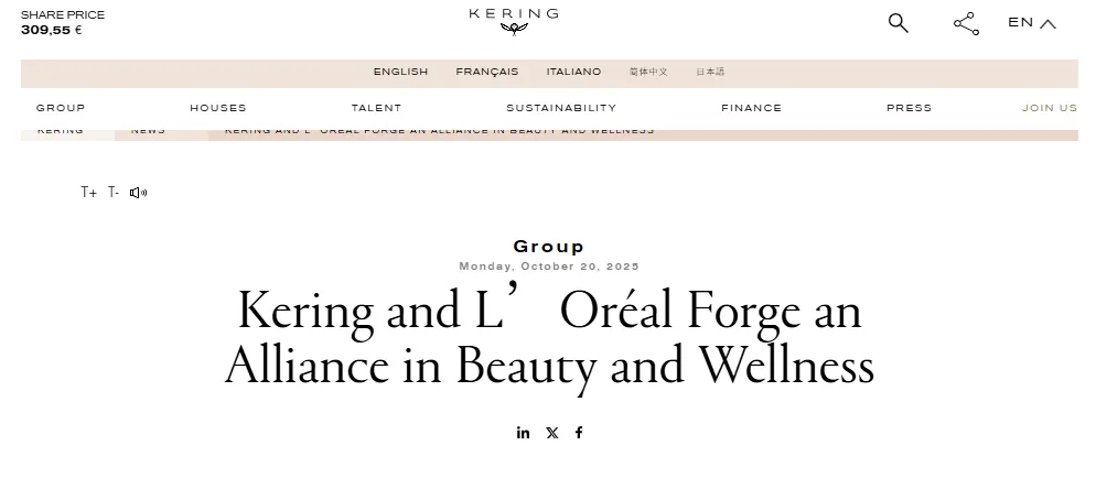開雲集團CEO Luca de Meo 表示,“此次戰略聯盟對開雲而言是關鍵一步。與全球美妝領導者聯手,能加速旗下主要品牌在香水和化妝品領域的發展,實現規模效應,釋放長期潛力,就像YSL美妝在歐萊雅管理下取得成功那樣。”