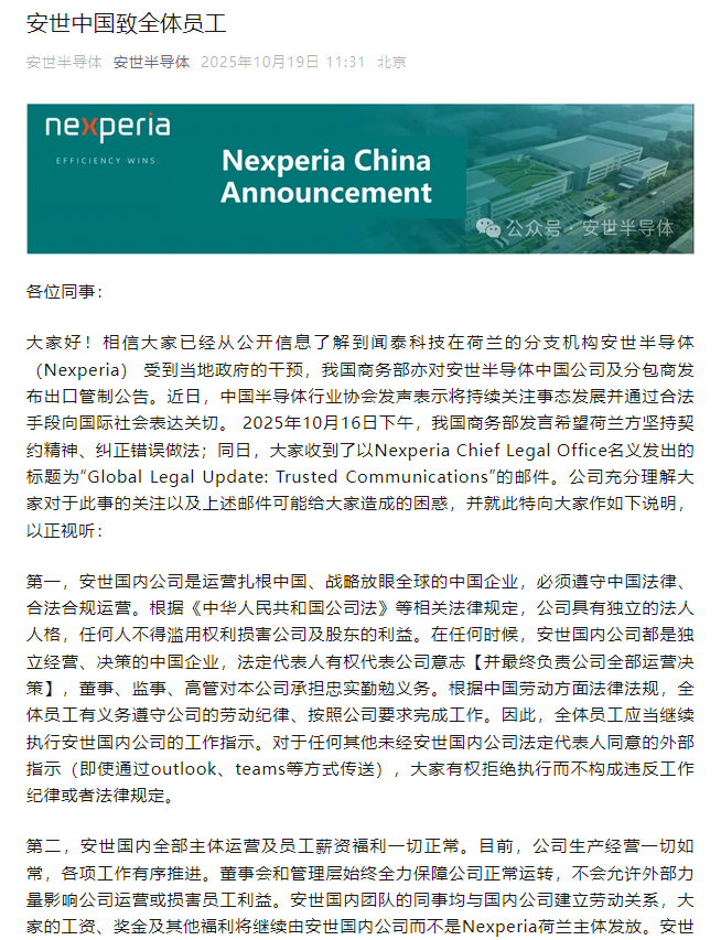安世中國同時強調,安世國內全部主體運營及員工薪資福利一切正常,各項工作有序推進。董事會和管理層始終全力保障公司正常運轉,不會允許外部力量影響公司運營或損害員工利益。安世國內團隊的同事均與國內公司建立勞動關係,員工的工資、獎金及其他福利將繼續由安世國內公司而不是Nexperia荷蘭主體發放。安世國內有能力、有責任、有意願保障全體員工權益,並繼續營造安心的工作環境。