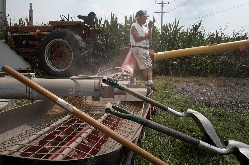 當地時間2025年8月1日,美國伊利諾伊州德懷特,農民約翰·達菲將穀倉中的大豆裝入卡車,運往糧庫出售。受關税影響,美國大豆農場主面臨“豐產不豐收”困境。 視覺中國