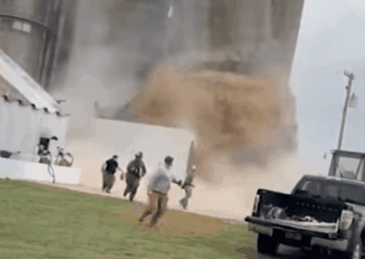 7分鐘後,這座糧倉轟然倒塌……視頻畫面顯示,短短幾秒鐘,濃煙與大豆瞬間四散,電線也被打斷,甚至冒出火花,現場人員嚇得四散奔逃。
