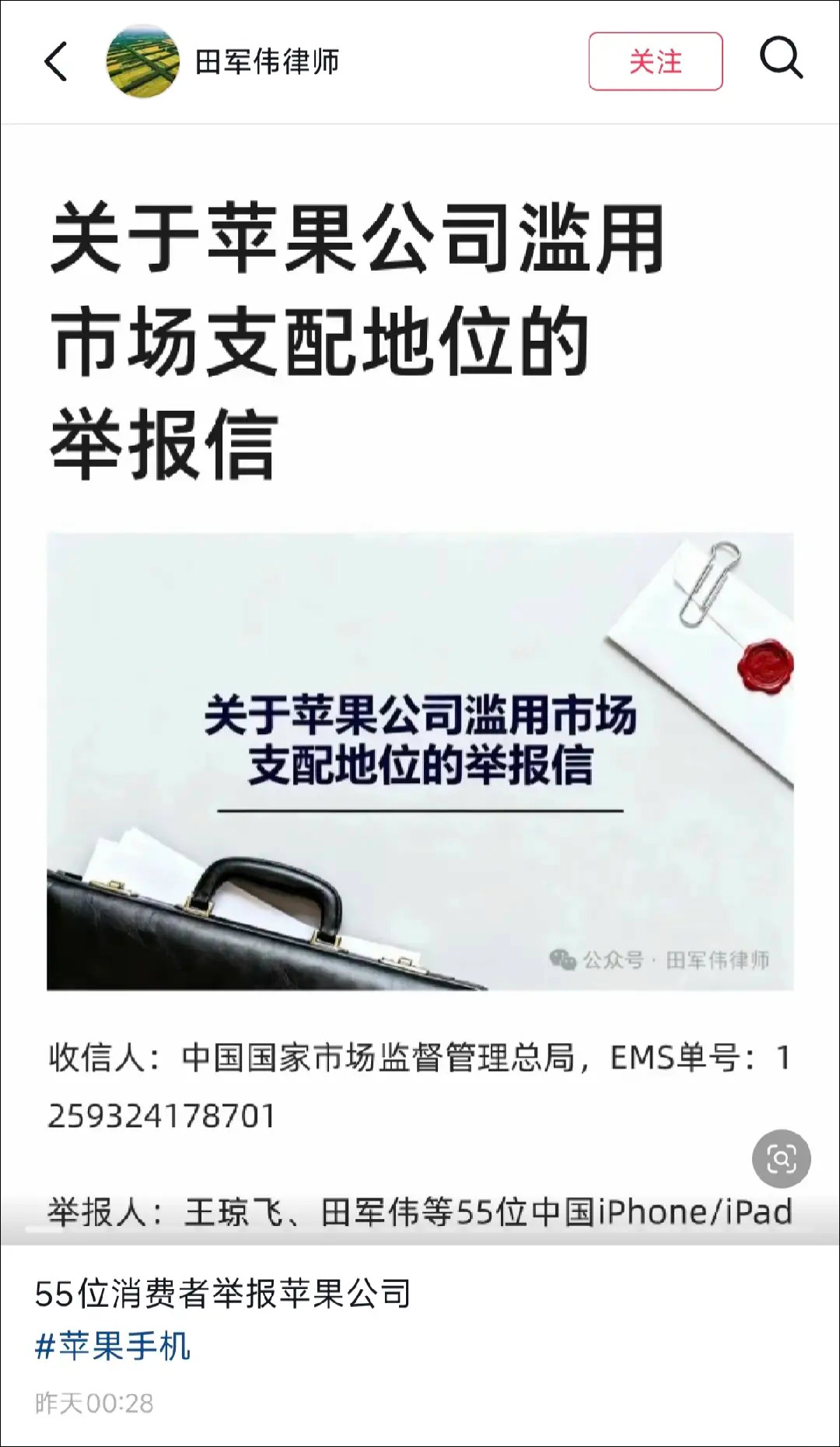 10月20日,一封《關於蘋果公司濫用市場支配地位的舉報信》在網絡曝光,引發廣泛關注。在這封舉報信中,以王瓊飛、田軍偉為代表的55名中國消費者,向國家市場監督管理總局發起行政舉報,指控蘋果公司濫用市場支配地位,強制限制應用程序分發和支付渠道,並收取高額佣金。