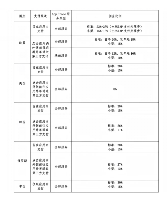 綜合公開信息顯示,自歐盟2024年《數字市場法》實施以來,蘋果已允許開發者引導用户使用外部支付渠道,並將佣金降至10%–20%(視服務類型和開發者規模而定);而蘋果在美國雖仍強制用户使用IAP,但已允許通過外鏈跳轉第三方支付,且不收取任何佣金;韓國與俄羅斯則在允許外部支付的同時,分別收取11%–26%和12%–27%的階梯式佣金。