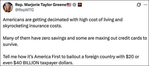 佐治亞州共和黨眾議員瑪喬麗·泰勒·格林在X上發帖,怒斥特朗普政府對阿根廷的援助。 社交媒體