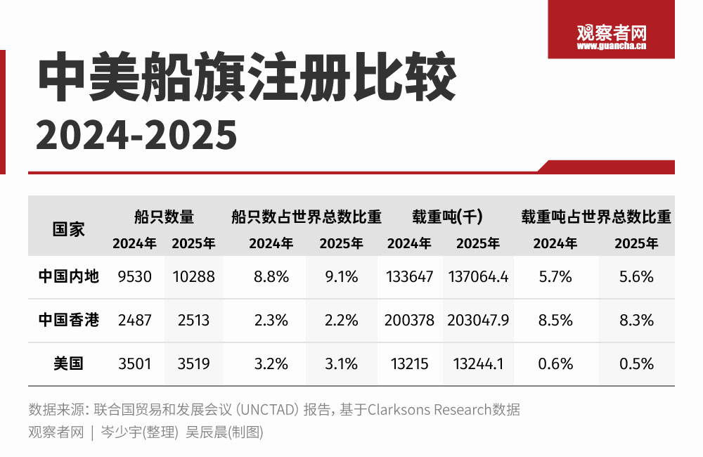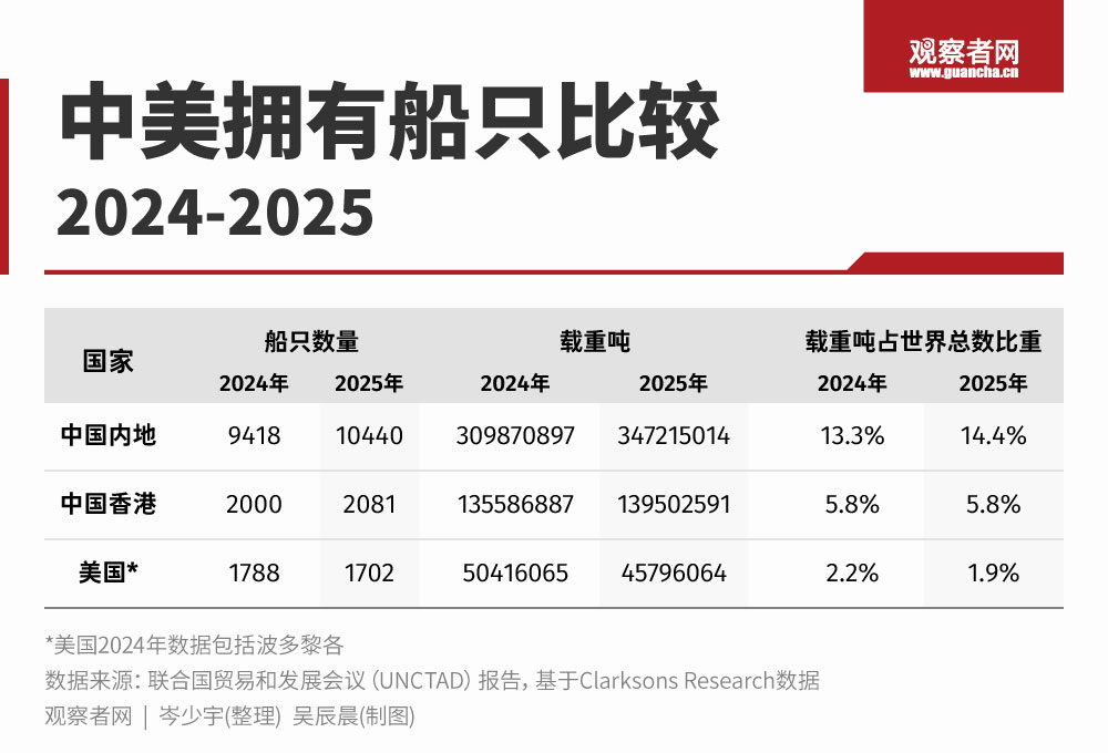 按照聯合國貿易和發展會議根據Clarksons Research數據製作的報告,中國內地2025年1月1日擁有的船隻為10440艘,而2024年1月1日是9418艘。
