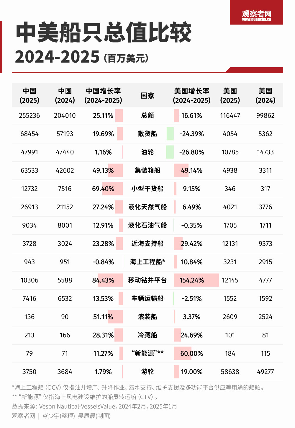 中國內地各類船隻總值在一年內全面增長,美國也大部分增長,但散貨船、油輪反而大跌了。