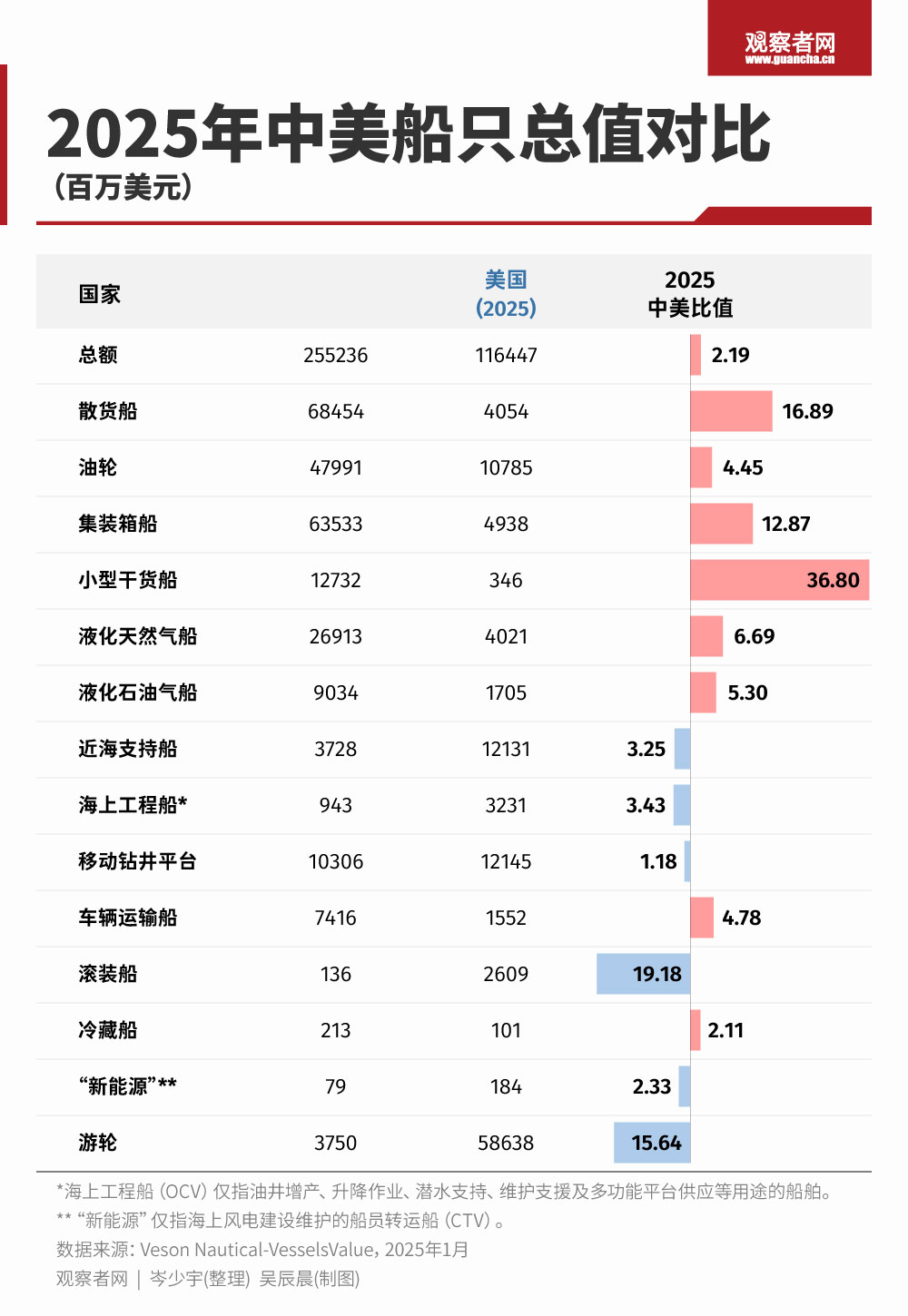 美國有壓倒性優勢的是傳統強項遊輪,以及滾裝船。中國則在其他運輸船隻類型上,全面開花。