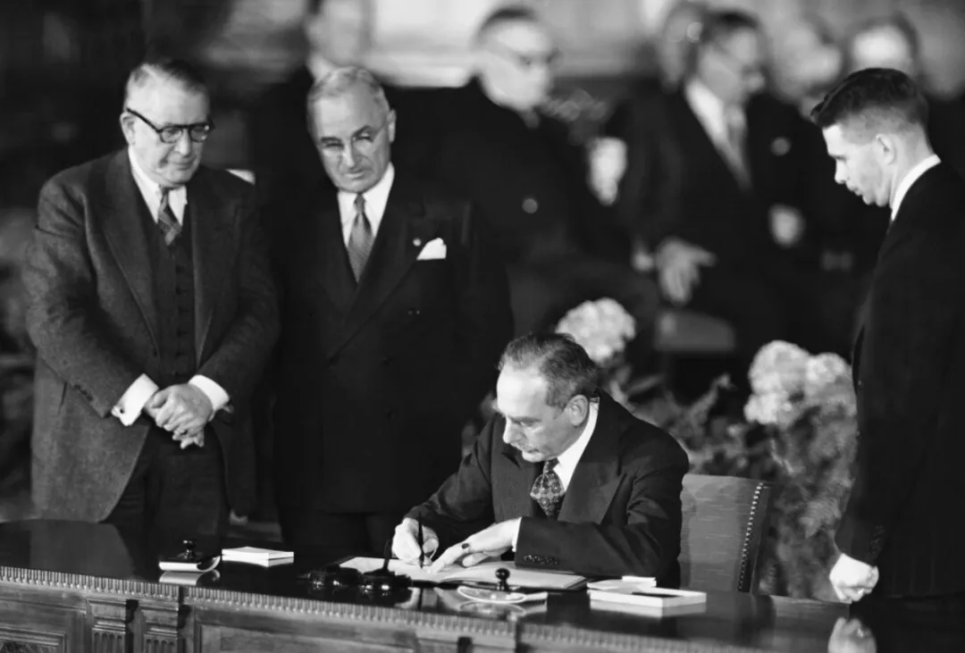 美國總統杜魯門(左二)1949年在華盛頓出席北《大西洋公約組織條約》簽署儀式。 圖源:美聯社
