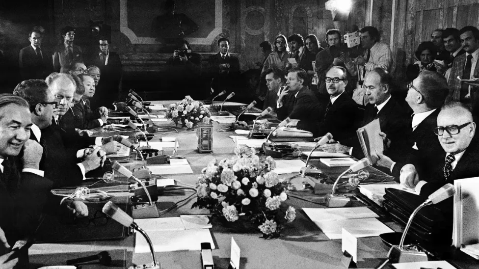 1975年11月15日至17日,第一次西方主要工業國首腦會議在法國朗布依埃城堡召開。這就是後來發展成G7峯會的開端。 圖源:法新社
