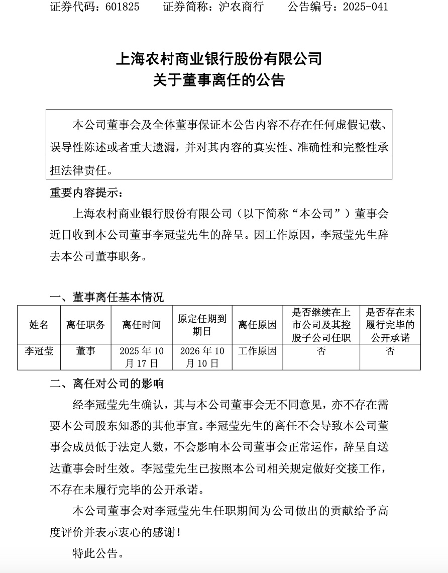 10月20日,上海農村商業銀行(以下簡稱“滬農商行”,601825.SH)發佈公告稱,公司董事李冠瑩先生因工作原因辭去董事職務。這位身兼太平資產管理有限公司(以下簡稱“太平資產”)副總經理並主持工作的金融高管離去,其意義不止於一次簡單的人事更迭。