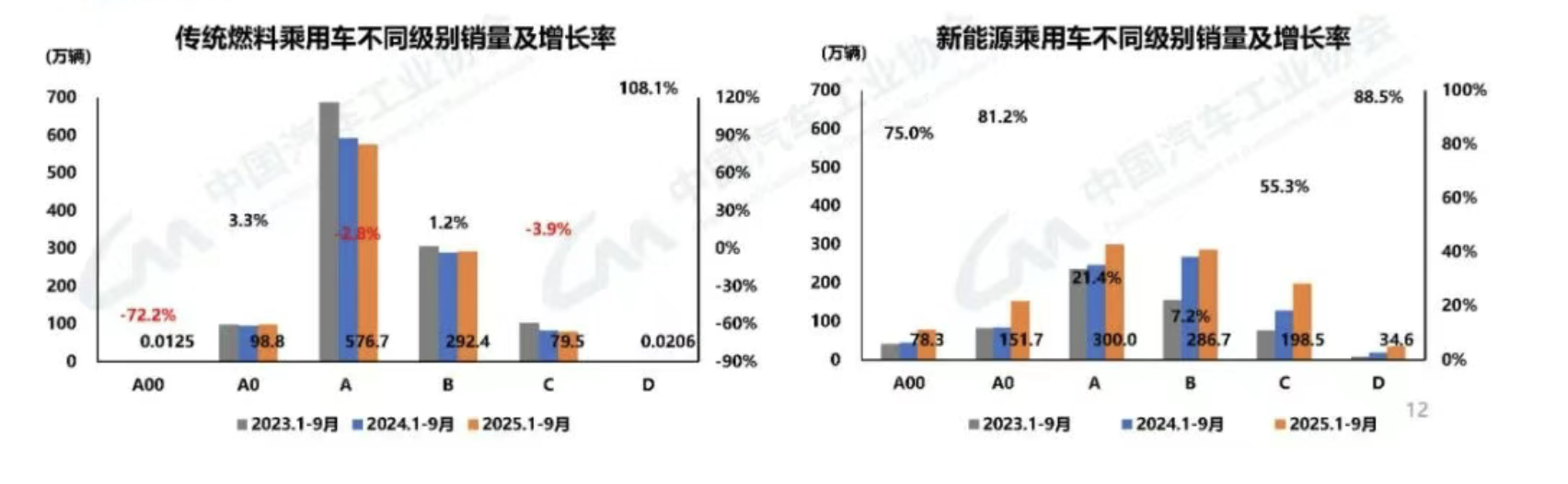 1—9月,傳統燃料/新能源乘用車不同級別銷量及增長率 中汽協