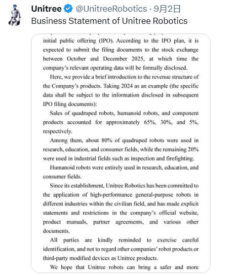 此外,在9月2日,宇樹科技在社交平台“X”上的認證賬號就發表聲明稱:“公司正積極推進首次公開募股(IPO)的籌備工作”,並表示“預計將於10月至12月間向證券交易所提交上市申請文件,屆時相關運營數據將正式披露。”