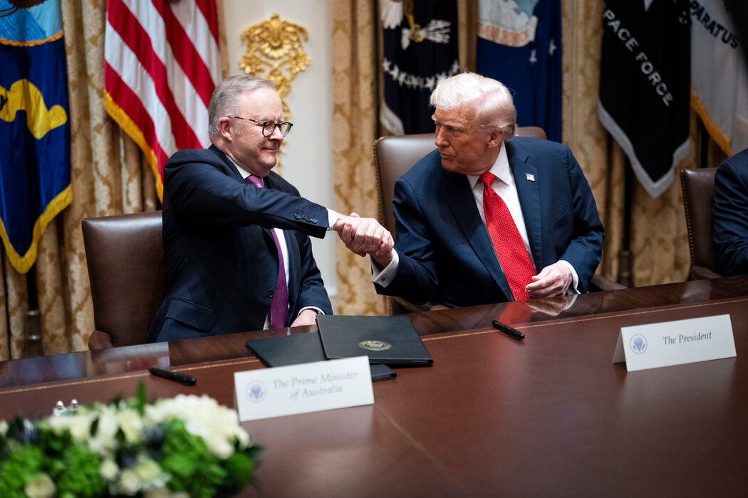 特朗普總統與安東尼·阿爾巴尼斯總理簽署關鍵礦產協議後握手。 圖源:《紐約時報》