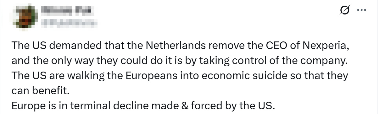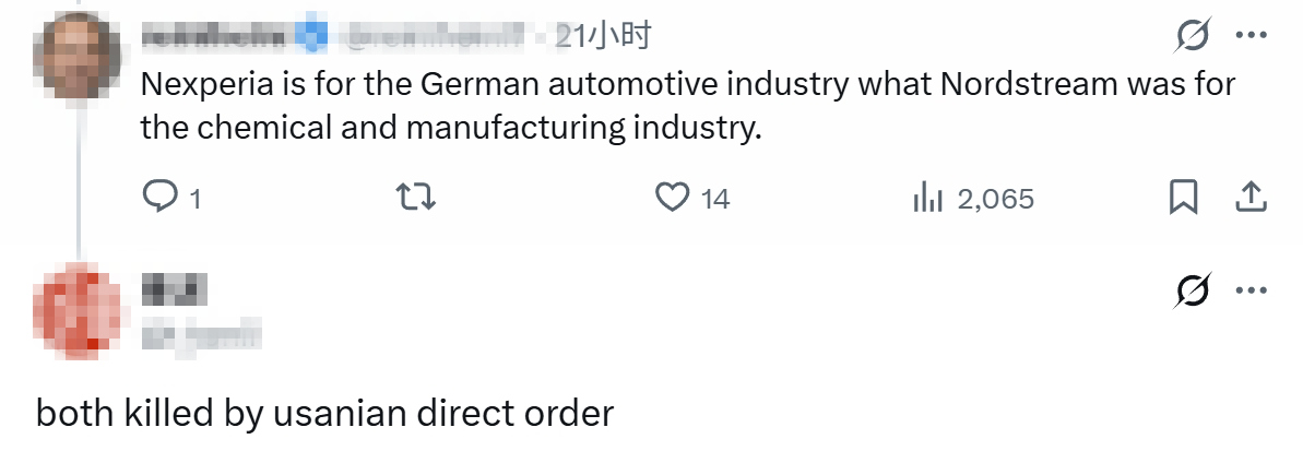 “安世半導體之於德國汽車產業,就如同‘北溪’天然氣管道之於化工及製造業。”另一人則犀利補充道,“但這兩者都遭到了美國直接下令抹殺”。
