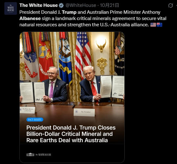 20日,美澳簽署關鍵礦產協議 推文截圖