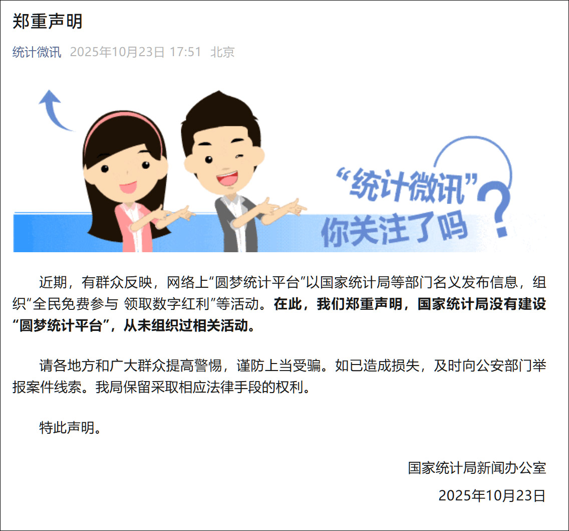 近期,有羣眾反映,網絡上“圓夢統計平台”以國家統計局等部門名義發佈信息,組織“全民免費參與領取數字紅利”等活動。在此,我們鄭重聲明,國家統計局沒有建設“圓夢統計平台”,從未組織過相關活動。