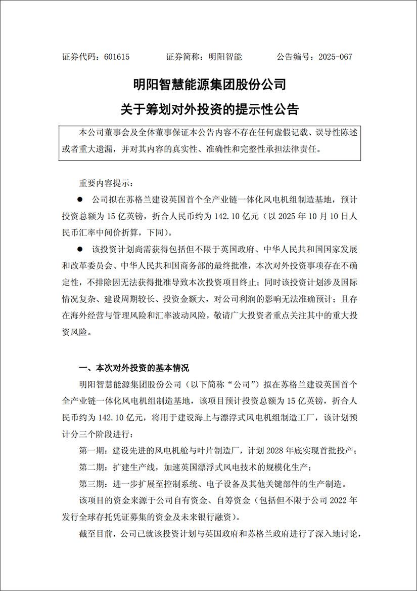 日前,明陽智能發佈公告稱,擬在蘇格蘭建設英國首個全產業鏈一體化風電機組製造基地,該項目預計投資總額為15億英鎊,摺合人民幣約為142.10億元,將用於建設海上與漂浮式風電機組製造工廠。