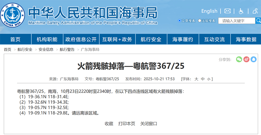 據中國海事局網站消息,10月21日,廣東海事局發佈航行警告: