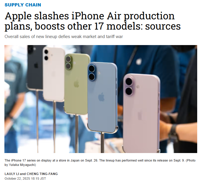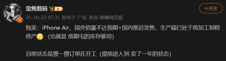 10月22日,是蘋果超薄手機iPhone Air在中國大陸發售的日子,但有數碼博主爆料稱,iPhone Air因國外銷量未達預期和國內推遲發售等原因,生產端已進入前加工製程停產狀態,目前處於“攢訂單再重新開工”的產能調整階段。