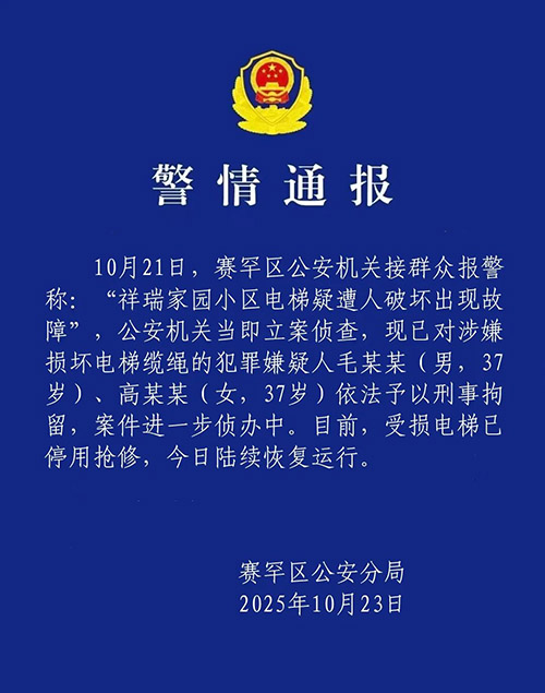 10月21日,賽罕區公安機關接羣眾報警稱:“祥瑞家園小區電梯疑遭人破壞出現故障”,公安機關當即立案偵查,現已對涉嫌損壞電梯纜繩的犯罪嫌疑人毛某某(男,37歲)、高某某(女,37歲)依法予以刑事拘留,案件進一步偵辦中。目前,受損電梯已停用搶修,今日陸續恢復運行。