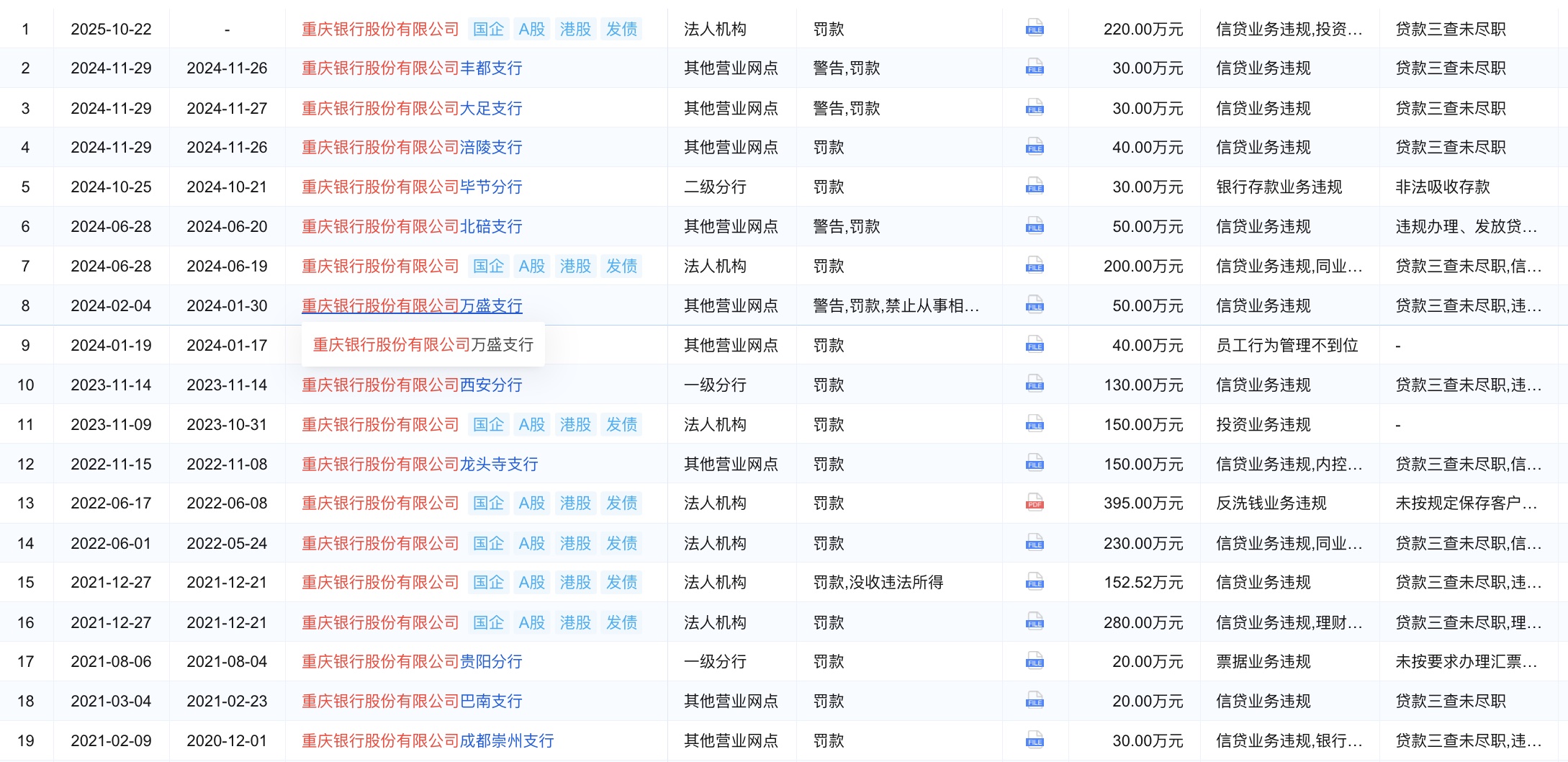 這已是該行今年以來收到的又一張罰單。作為西部地區成立最早的地方性股份制商業銀行之一,重慶銀行近年來在追求業務擴張的同時,合規問題頻發,監管處罰不斷。從2021年至今,該行已累計收到超過千萬元的罰款,違規事項涵蓋貸款管理、投資業務、反洗錢等多個領域。
