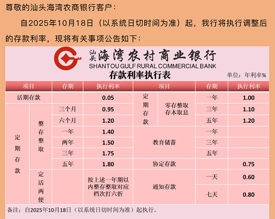 同樣在近期,汕頭灣海農商銀行也加入了下調行列。自10月18日起,該行定期存款整存整取三個月、六個月、一年、兩年、三年及五年期年化利率,分別調整為0.95%、1.20%、1.40%、1.50%、1.75%和1.80%,整體較此前下調15至20個基點。