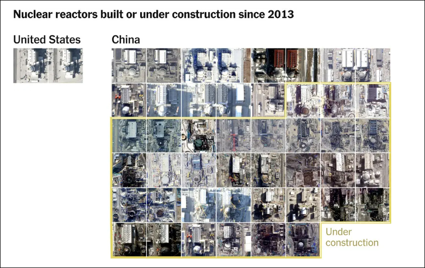 自2013年以來,美國僅新建了兩座核反應堆,同期中國建成13座,另有33座正在建設中。 《紐約時報》