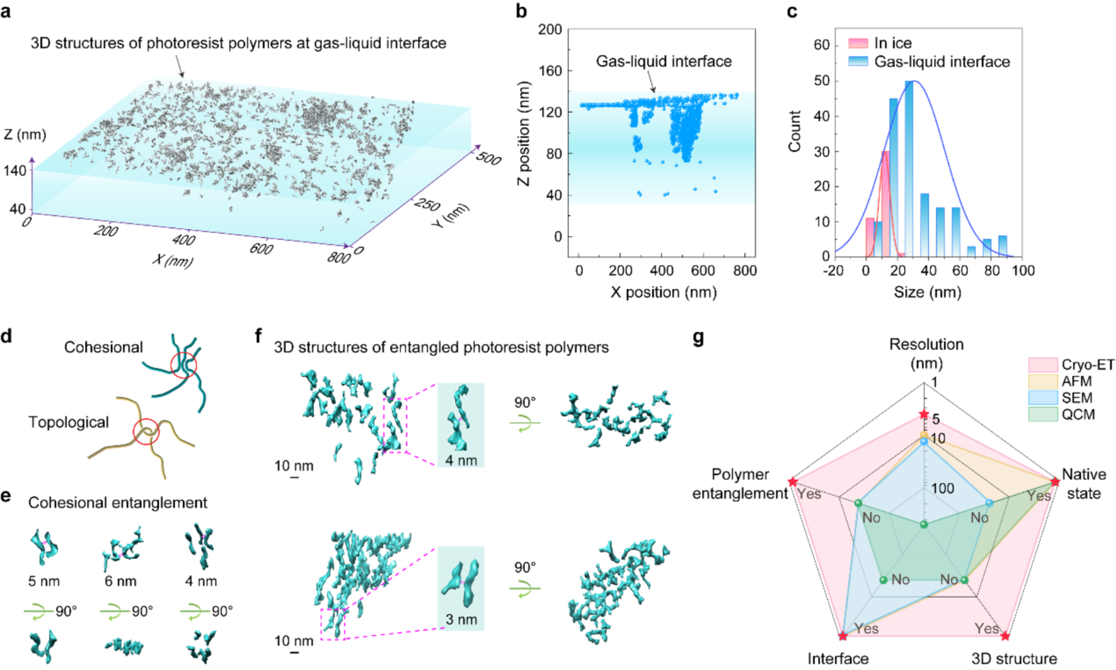 該技術帶來諸多新發現。論文通訊作者之一、北京大學化學與分子工程學院高毅勤教授介紹,以往業界認為溶解後的光刻膠聚合物主要分散在液體內部,然而三維圖像顯示它們大多吸附在氣液界面;團隊還首次直接觀察到光刻膠聚合物的“凝聚纏結”,其依靠較弱的力或者疏水相互作用結合;而且,吸附在氣液界面的聚合物更易發生纏結,形成平均尺寸約30納米的團聚顆粒,這些“團聚顆粒”正是潛在的缺陷根源,它們容易沉積到精密的電路圖案上,讓本該分開的電路連在一起。