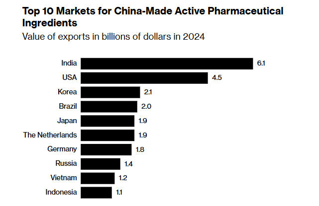 中國製造原料藥的十大市場,美國僅次於印度,位居第二 彭博社製圖