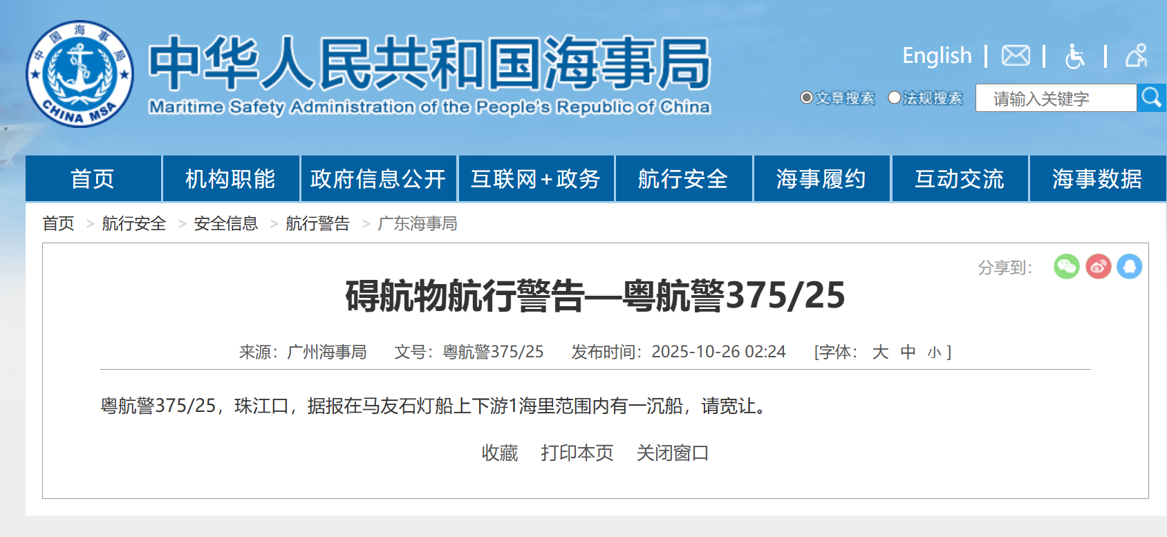 廣州海事局發佈的航行警告顯示,在馬友石燈船上下游1海里範圍內有一沉船。