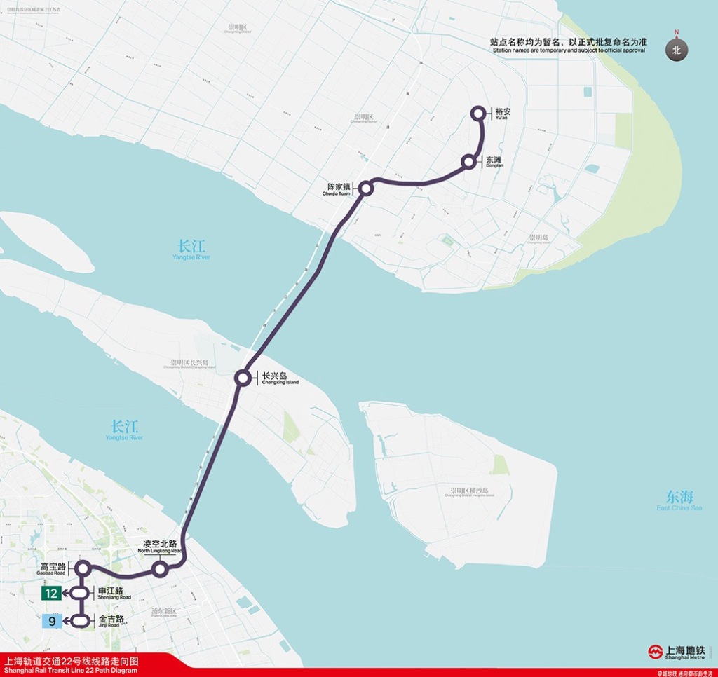 上海軌道交通22號線(崇明線)線路走向圖。上海地鐵供圖