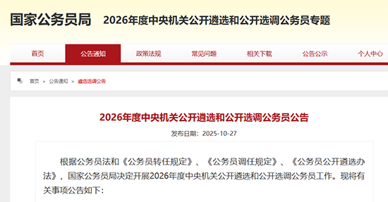國家公務員局網站10月27日消息,2026年度中央機關公開遴選和公開選調公務員報名將於28日上午8時開始。