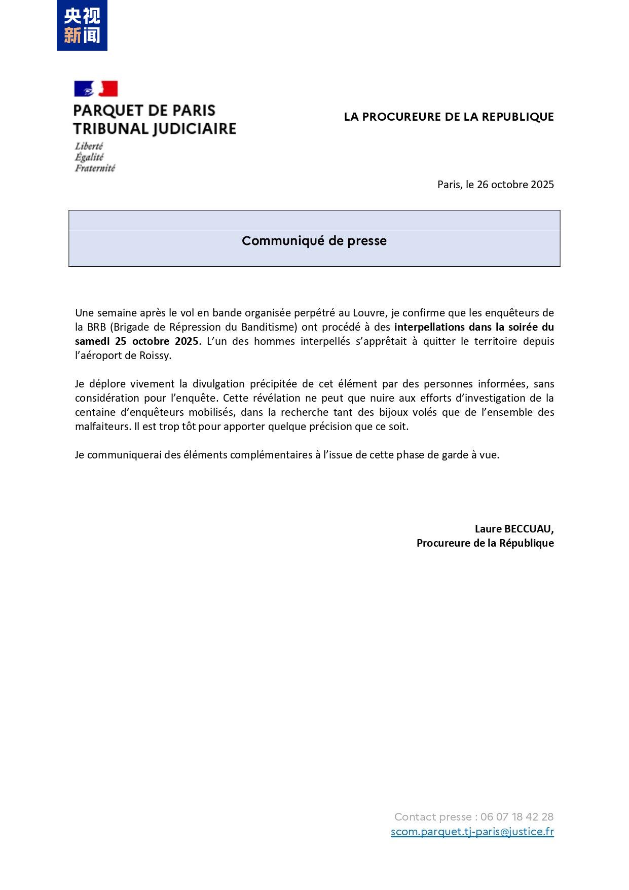 當地時間26日,巴黎檢方發表聲明,確認盧浮宮搶劫案已有嫌疑人被捕。