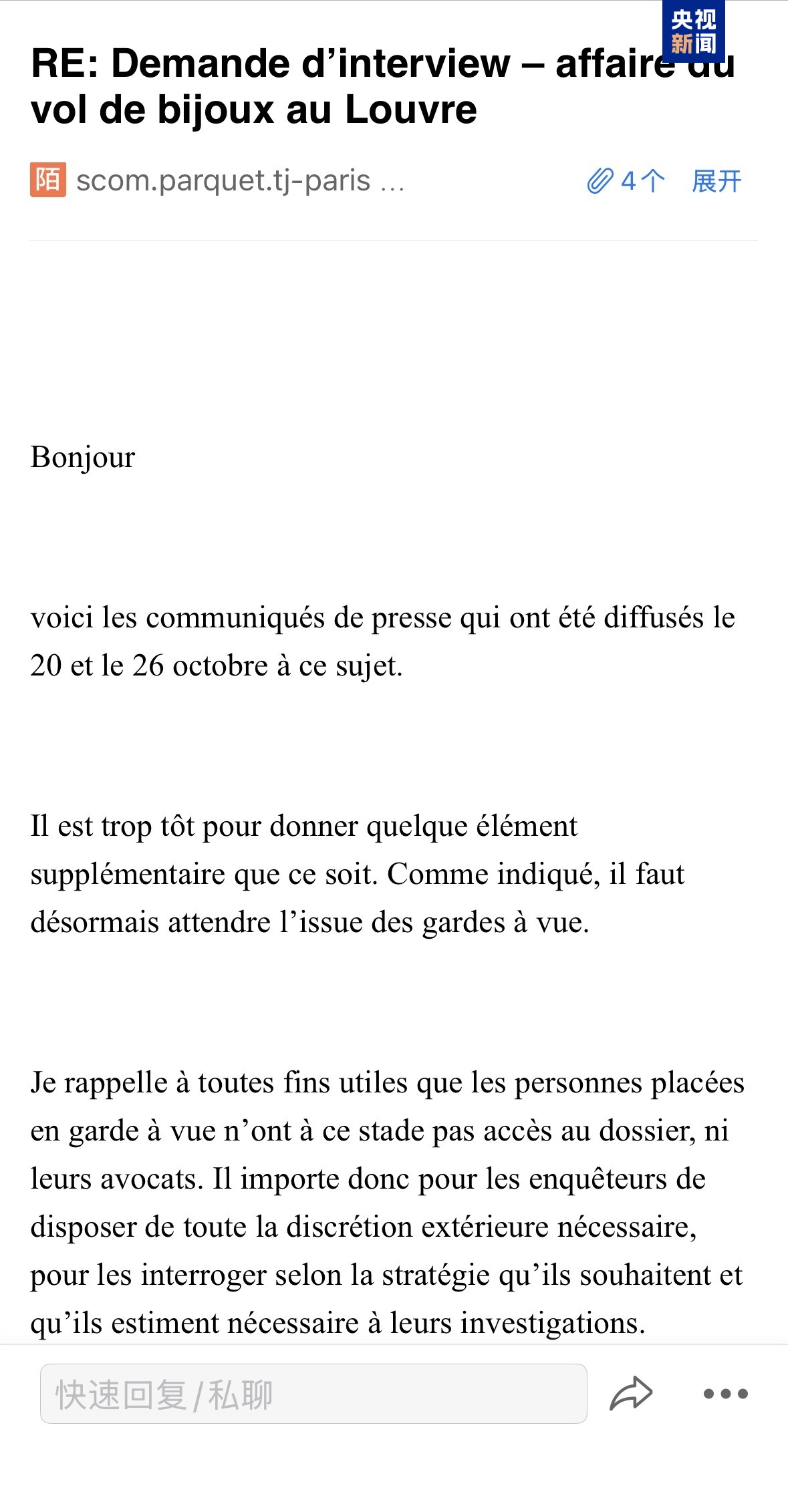 巴黎檢方發送給總枱記者的郵件,表示目前尚無法公佈更多案件細節。