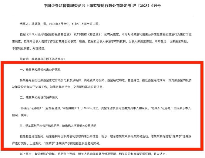 近日,證監會公佈行政處罰決定書顯示,海富通基金原基金經理楊寧嘉因利用職務便利向好友透露未公開信息,構成“老鼠倉”違法行為,被處以50萬元罰款。