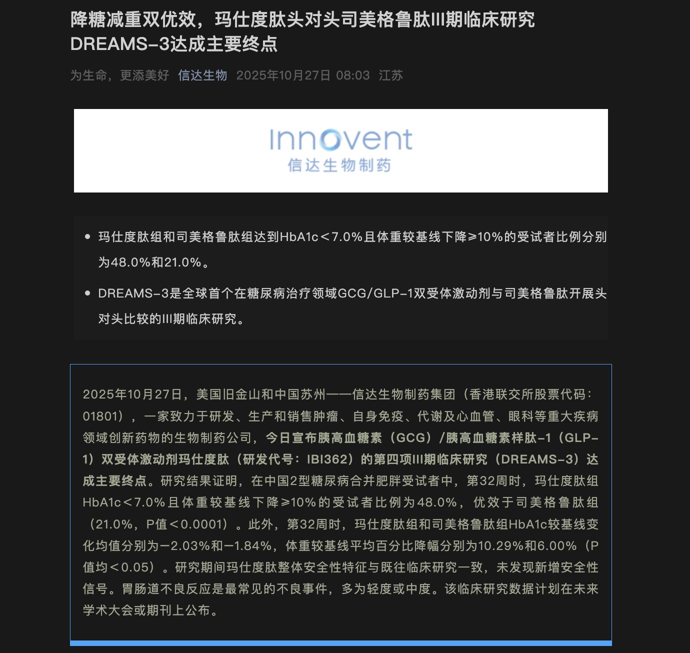 10月27日,信達生物(01801.HK)宣佈,其自主研發的GCG/GLP-1雙受體激動劑瑪仕度肽,在關鍵III期臨牀研究DREAMS-3中成功達到主要終點。這項研究的意義非同尋常,它是全球首個將國產同類藥物與跨國藥企巨頭諾和諾德的“藥王”司美格魯肽進行直接對比的III期臨牀試驗。