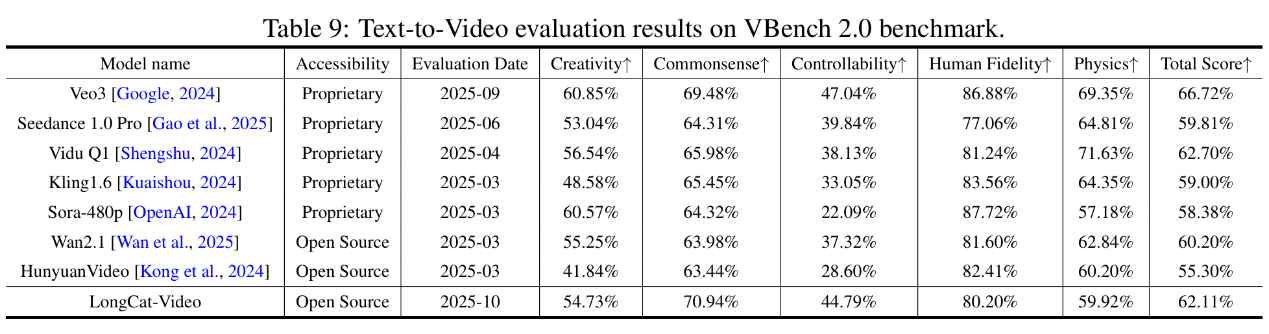 在公開評測平台VBench 2.0上,LongCat-Video在“常識理解”一項中以70.94%的得分位居所有開源模型第一,總分達到62.11%,僅次於谷歌Veo 3與生數Vidu Q1等商用閉源模型。
