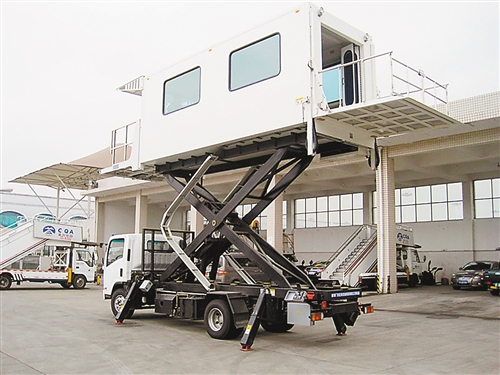 當然,鄭智化所使用的並非客梯車,因為客梯車都是一級級台階,輪椅上不來。把他送上飛機用的是一種更為少見的車型,那就是升降平台車。如果單從外形與運作模式來看的話,升降平台車其實和飛機的餐車還挺相似的,都是把車廂升高後地板與艙門口對接,進行人員來往或者運輸。