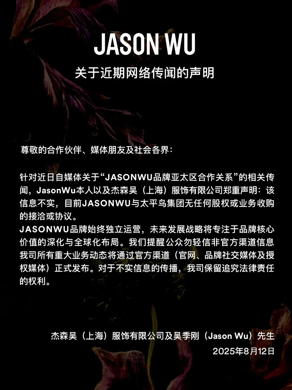 收購成熟高端品牌確實是服裝企業常用的升級路徑。在業內認為太平鳥或將通過收購Jason Wu探索高端女裝業務線時,這一收購很快陷入“羅生門”。Jason Wu官方聲明稱,“品牌與太平鳥集團無任何股權或業務收購的接洽或協議”。