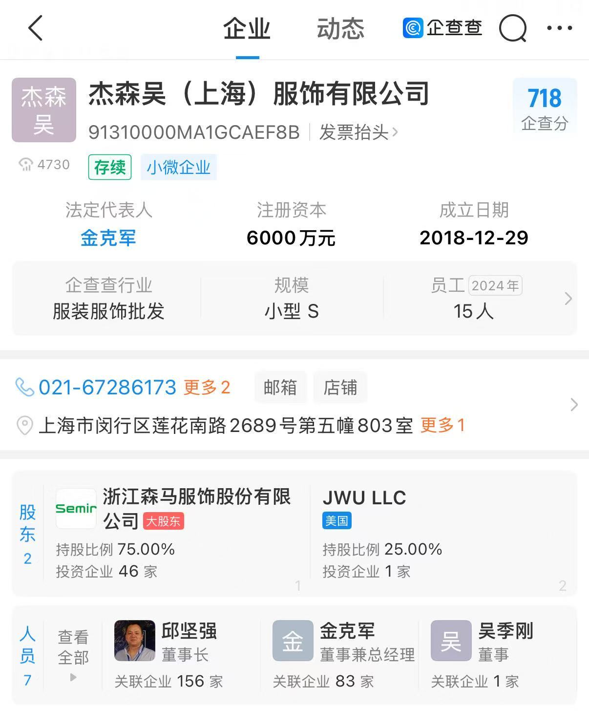 實際上,Jason Wu的背後早已有另一傳統服飾巨頭森馬的身影。據企查查數據顯示,Jason Wu在中國市場的運營公司為傑森吳(上海)服飾有限公司,股東是浙江森馬服飾股份有限公司和JWU LLC(Jason Wu美國公司),二者分別持股75%和25%。傑森吳的董事長由森馬董事長邱堅強擔任。