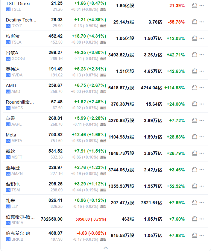 特斯拉收漲4.31%,谷歌A漲3.6%,英偉達和蘋果至多漲2.81%,Meta、微軟、亞馬遜至多漲1.51%。