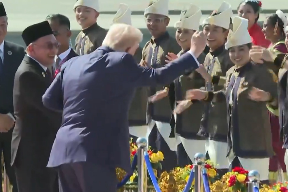 當地時間10月26日,飛抵馬來西亞首都吉隆坡的特朗普,在機場手舞足蹈。 視頻截圖