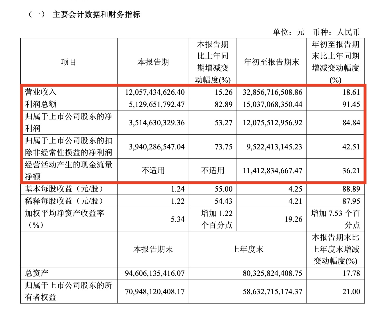 業績報顯示,2025年前三季度,公司實現營業收入328.57億元,同比增長18.61%;歸母淨利潤120.76億元,同比增長84.84%;經營現金流108.7億元,同比增長35%。單看第三季度,公司實現營業收入120.57億元,同比增長15.26%;歸母淨利潤35.15億元,同比增長53.27%。