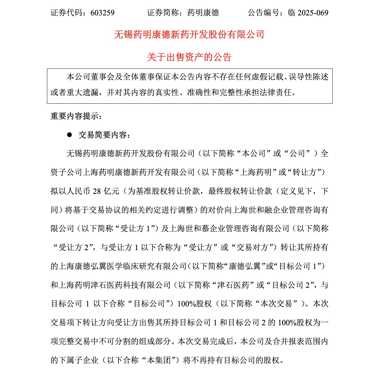 與三季報業績同時披露的資產剝離公告,為理解藥明康德的戰略意圖提供了重要線索。以28億元向高瓴投資出售康德弘翼和津石醫藥100%股權,這一動作並非簡單的“賣資產換現金”,而是公司在複雜外部環境下聚焦核心業務、優化資產結構的戰略選擇。