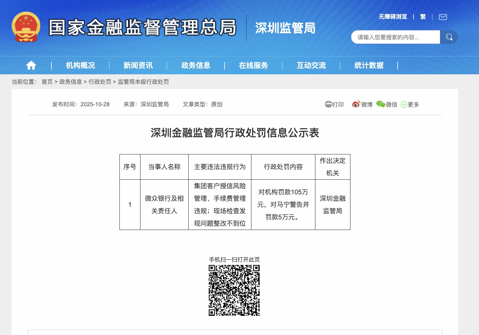 10月28日,國家金融監督管理總局深圳監管局發佈行政處罰信息,全國首家民營銀行微眾銀行因集團客户授信風險管理、手續費管理違規以及現場檢查發現問題整改不到位等多項違法違規行為,被處以105萬元罰款,相關責任人馬寧同時受到警告並被罰款5萬元。